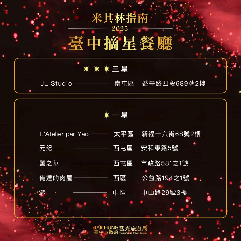 國際極具專業性的《米其林指南2025》於今(19)日公布米其林指南星級及入選餐廳完整名單,本市首度有餐廳獲得米其林綠星肯定,「JL Studio」延續著職人專業態度連續三年奪得米其林三星,而「地坊」也拿下新進綠星餐廳,以「料理不只是味道,而是一場與土地的對話」的精神,受米其林綠星肯定。本市共計有6家餐廳得到米其林星級,共摘下8顆星,另有34家入選餐廳,與上週公布必比登推介23家餐廳,今年本市總計63間餐廳入榜米其林指南,料理種類遍佈中式、日式、歐式、東南亞料理等,來到台中一站滿足世界美味。