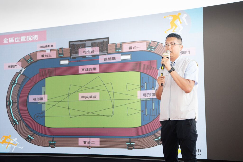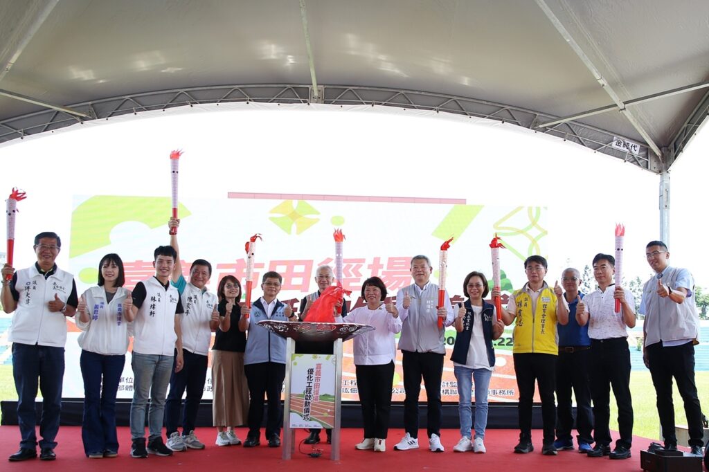 黃敏惠市長補充,以嘉義市立田徑場為軸心,鄰近國民運動中心、網球場以及市立體育館,是嘉義市東區的休閒運動聚落,此次工程不僅改善田徑場內及周邊設施,提升基層體育培訓環境,更在田徑場外圍融入木都意象的設計,詮釋嘉義市的城市品牌與運動樂活的城市精神。