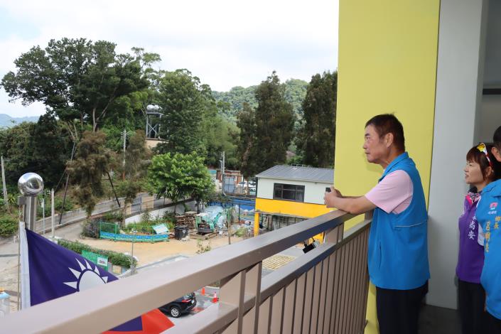 縣長鍾東錦與縣議員、三義鄉長、主席、代表等人亦逐層視察施工品質,並遠眺美麗的景觀,他肯定視野、建築設計都非常有特色,學校雖小,但可愛、漂亮。