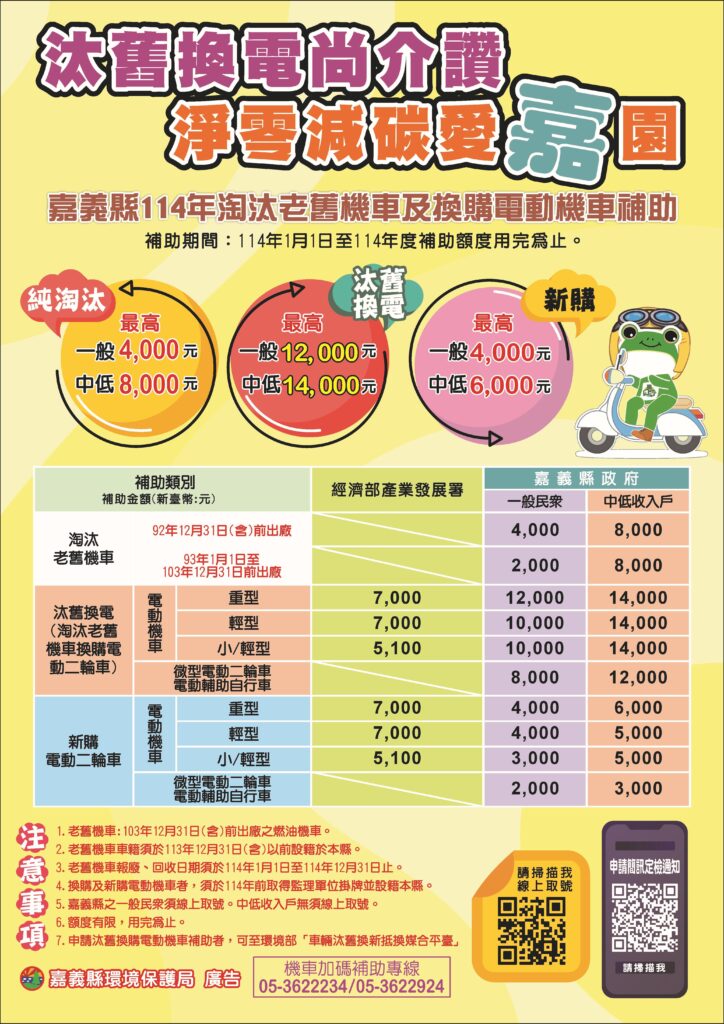 嘉義縣114年3月公布淘汰老舊機車、換購及新購電動二輪車補助計畫後,民眾申請踴躍,淘汰老舊機車補助額度528萬已用罄,如今再加碼300萬元,額度有限,呼籲民眾把握機會。