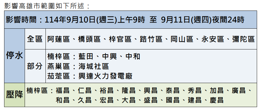 配合岡山捷運工程!高雄市10行政區9月10日9時起停水39小時