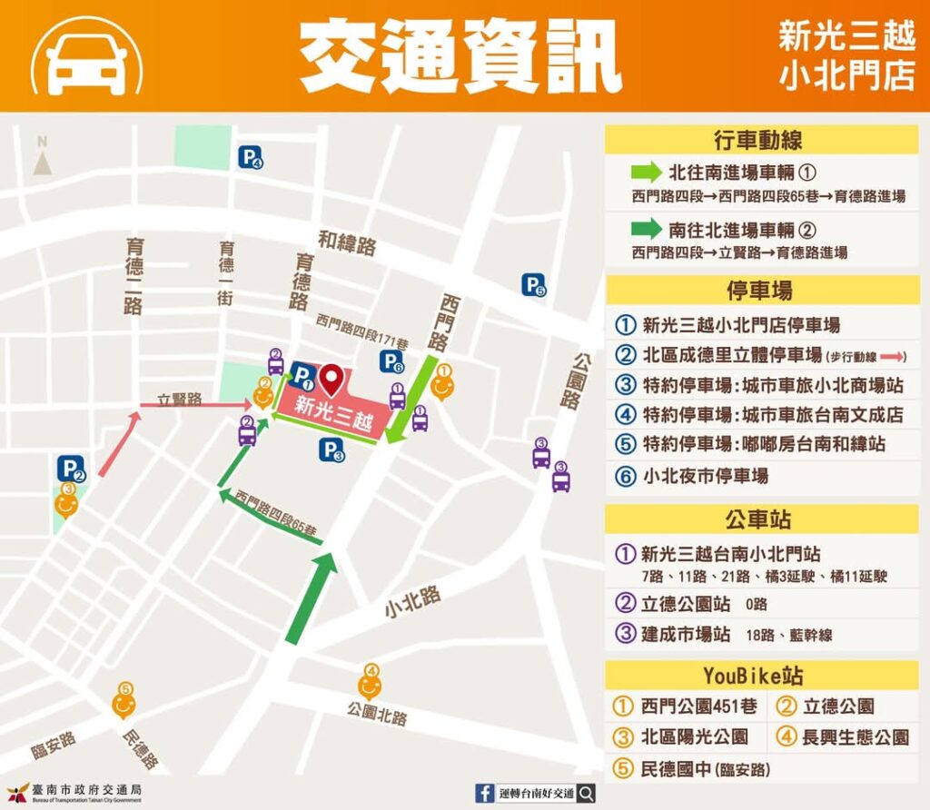 第五分局表示,新光三越小北門店地下停車場出入口設置於育德路上,車輛動線採「右進右出」,呼籲欲停放商場地下停車場之民眾,可從西門路四段右轉立賢路後,再右轉育德路進入停車場入口,另因地下停車場空間有限,新光三越與周邊特約停車場合作,若遇地下停車場已滿場,義交人員會協助指揮駕駛人至周邊路外停車場,避免車道壅塞車輛無法動彈,目前周邊停車場計有城市車旅台南文成站(特約停車場)、小北夜市免費停車場、城市車旅小北商場站(特約停車場)、小北觀光夜市停車場、成德停四公有停車場及嘟嘟房台南和緯店(特約停車場)。