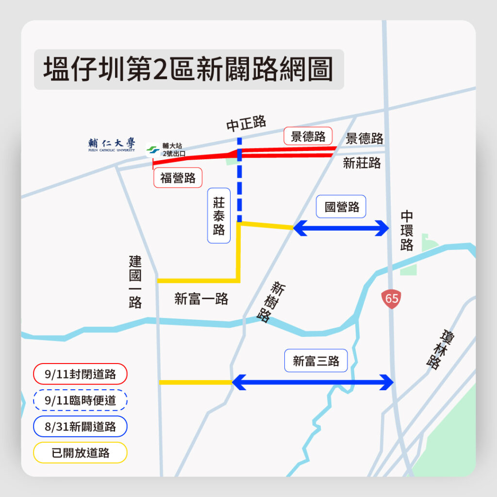 往來新莊中正路輔大商圈、建國一路美式賣場商圈的用路人請注意!隨著塭仔圳工程進展,該區域自7月起已陸續開放新闢道路的部分路段,接下來8月31日下午2點,將開放國營路、新富三路通往中環路的路段,9月11日中午12點才會封閉新樹路以西的福營路至捷運輔大站2號出口為止及景德路以利工程施作。