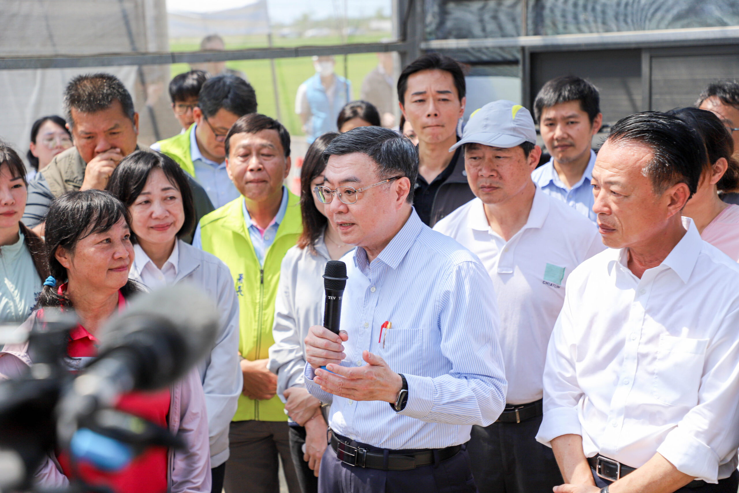 此行,卓院長先聽取農業部農糧署南區分署賴明陽分署長說明「颱風災損農業設施修復情形」,並於農友陪同下,與行政院李慧芝發言人、雲嘉南區聯合服務中心李碧菁副執行長、農業部陳駿季部長、蔡易餘立委、嘉義縣翁章梁縣長等人,關心溫室披覆組件破損更新及農作物種植現況。