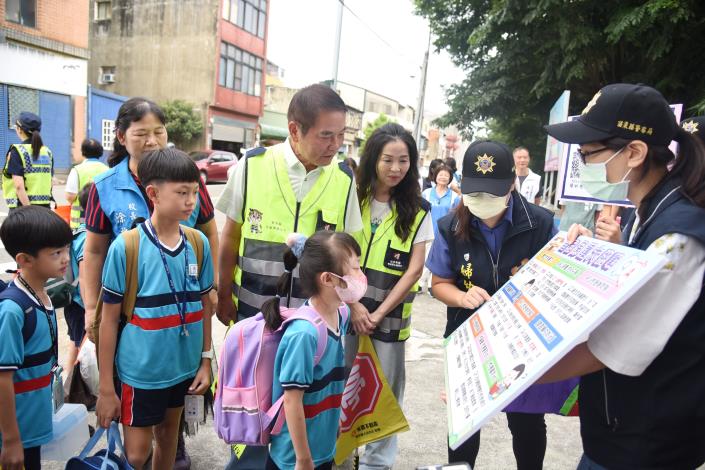 今年是114學年度第1學期開學日,縣長鍾東錦與夫人陳美琦一早抵達竹南海口國小校門口,關心學童上學的交通安全;警察局婦幼隊也派員宣導家暴防治、性騷擾防制、兒少保護及性別平等相關法令與防制要領,現場提供「自我保護大作戰」有獎徵答,小朋友熱烈參與。