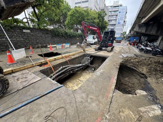 工務局表示,自來水公司8點到場後進行開挖,發現是250mm舊水管管裂開,該幹管為主要調水幹管,裂開約1公尺,水流出造成沖刷土石路基流失,AC路面掏空及人行道受損範圍約長25公尺,寬約2公尺長,2公尺深,自來水公司已全力進行搶修。