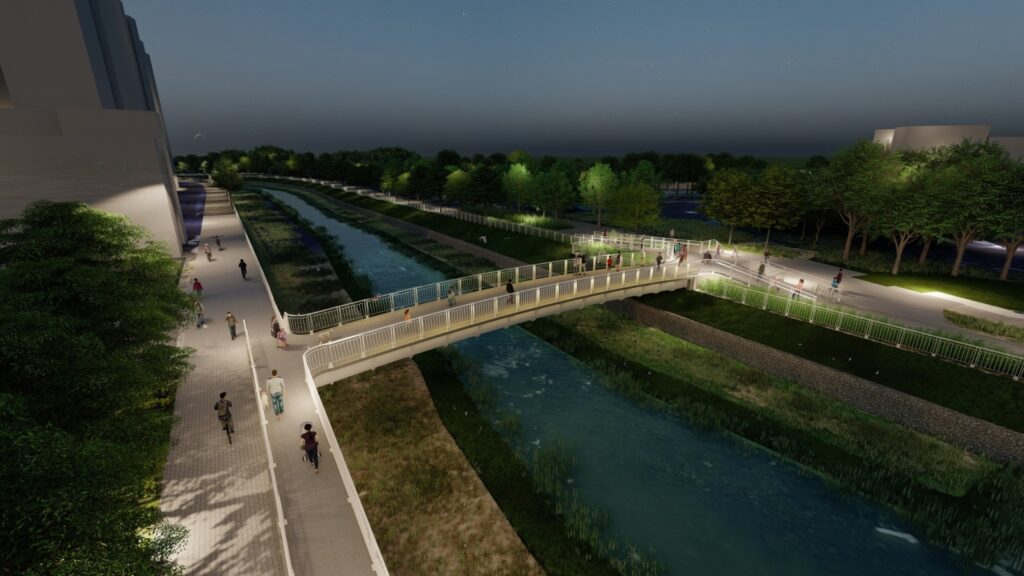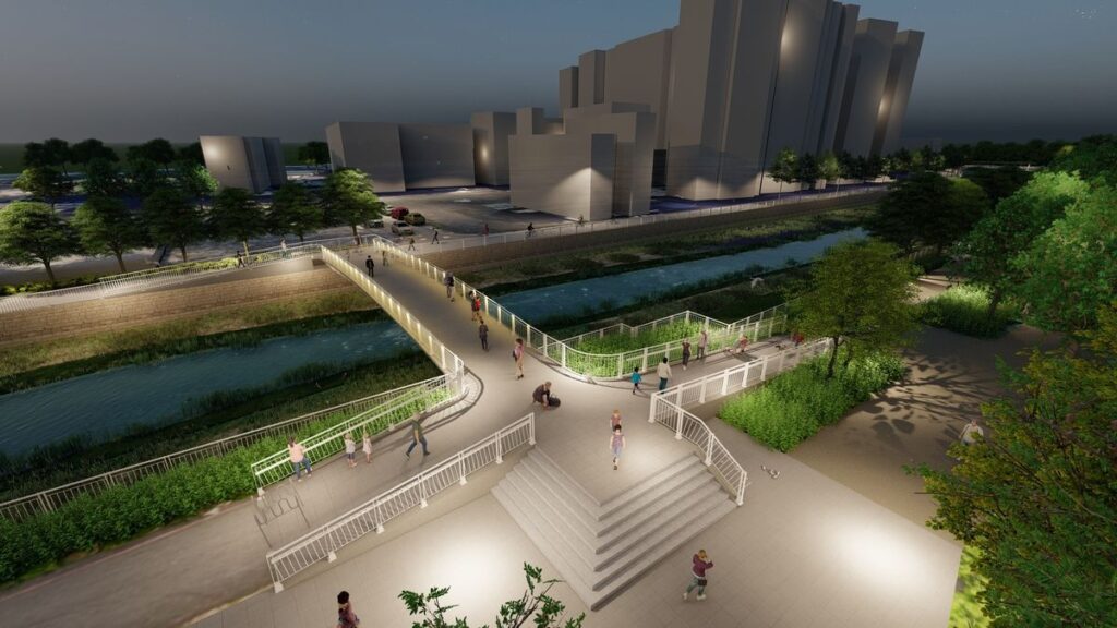 水利局表示,該座人行景觀橋總經費約新臺幣3,600萬元,由市府編列預算辦理,橋長約30公尺,橋寬約4.3公尺,採用雙管鋼拱橋,並設有無障礙坡道與夜間照明設備,橋台引道銜接大東公園側設計雙側斜坡道,串聯公園內自行車系統,兼顧美觀與安全,並充分考量不同年齡層的使用需求。