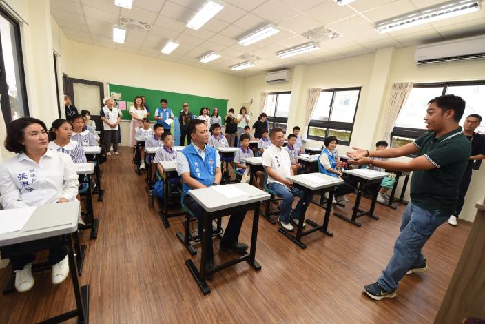 縣長鍾東錦與來賓隨後入座和學生參與英文和客語教學演示,觀摩英語教學後還融入分組PK賽,鍾東錦與來賓也大方用英語搶答,使原本略顯嚴肅的課程因而變得更活潑有趣。另外,縣府致力推動客家事務與客語為通行語言,深獲客委會肯定並贏得7連霸殊榮,此行自然不忘關注客語教學演示,聆聽師生演唱「轉動夢想」,來賓並逐一說出自己的夢想,有人想賺大錢、有人想睡好覺…,鍾東錦最想實現的就是做好軟硬體建設帶動苗栗發展進步;他再次鼓勵學生要習慣且經常講客家話,踴躍報名客語認證,攜手傳承祖先的智慧。