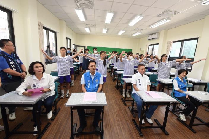 縣長鍾東錦今日上午率教育處團隊,偕同立委邱鎮軍、副議長張淑芬及縣議員、市民代表等來賓,以開箱方式舉行簡單的啟用儀式,再聽取處長葉慈慧與校長方麗萍簡介教室設計及內部各項設備;組合屋教室雖屬暫時性建築,但裡面課桌椅和置物櫃都是全新的,大屏螢幕和冷氣設備樣樣比照一般教室規格。