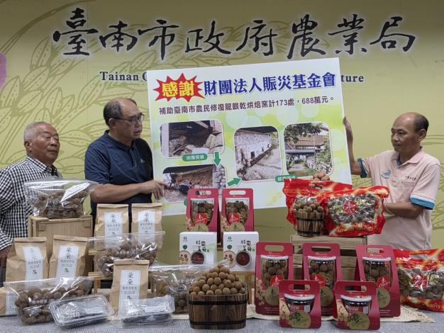 農業局長李芳林表示,特別感謝財團法人賑災基金會對台南市農業的大力支持,經歷0121楠西大地震,造成東山、六甲、楠西、白河、柳營、大內等區烘焙窯受損嚴重,經台南市政府向賑災基金會爭取,共獲補助農民修復龍眼乾烘焙窯 173 處,補助金額合計新台幣688萬元整。透過此補助能讓受災農戶迅速重建烘焙設施,並恢復農民生產能力,使古法土窯與傳統工藝得以延續,土窯能夠復原、香氣能夠回來,消費者才能繼續吃到那種帶點炭火、帶點淡淡煙燻味的龍眼乾。