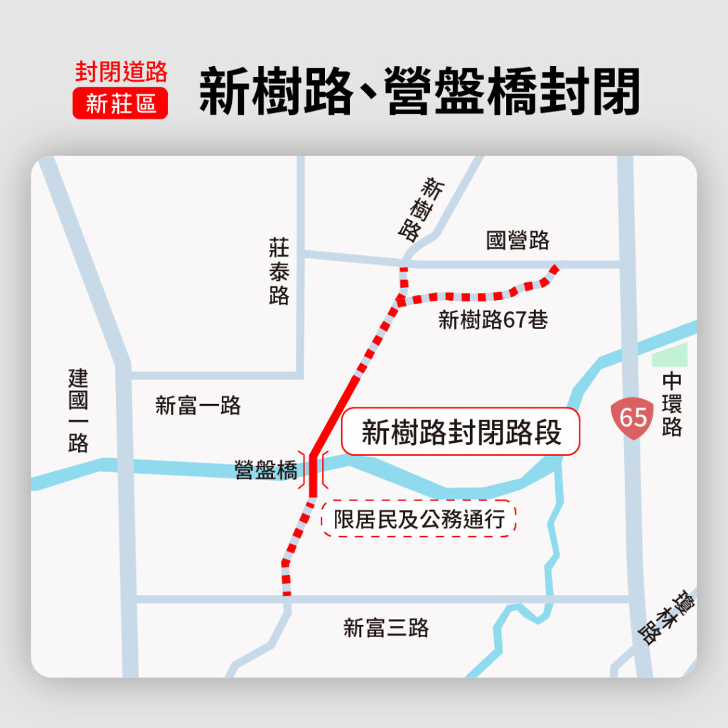 地政局指出,新樹路為往來新莊、樹林的重要聯外道路,但路幅狹窄已不敷使用,將由重新規劃的道路系統取代,位於新樹路上的營盤橋也同步進行改建,新營盤橋建成後將有30米寬、37米長,橋面中間預留泰板輕軌通行空間,新營盤橋西側也將搭建專屬自行車通行的橋樑,為減少施工期間的交通衝擊,地政局日前已先行開通數條道路,10月13日國營路至新富三路間的新樹路封閉後,用路人若從新莊往樹林方向,建議可由新樹路銜接「國營路→莊泰路→新富一路→建國一路」,若是從樹林往新莊方向,可改走「建國一路」,或由新樹路銜接「新富三路→中環路」再接續行駛(詳見改道行駛路線圖)。