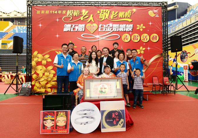 九九重陽將屆,苗栗縣政府為彰顯敬老、崇老精神,除於重陽節前分別由縣長鍾東錦、夫人陳美琦及副縣長邱俐俐攜賀禮一一慰訪縣內百歲人瑞外,今天也舉辦「114 年度模範老人、敬老楷模、鑽石婚及白金婚楷模表揚活動」,共頒獎表揚11對白金婚楷模、20對鑽石婚楷模、20位模範老人及20位敬老楷模。
