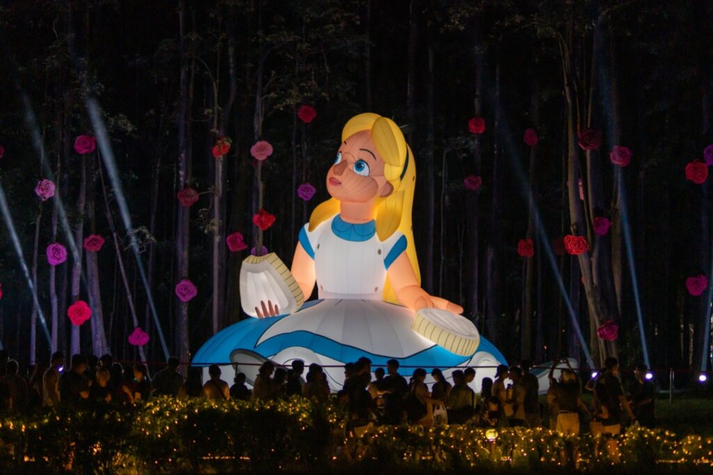 觀光新聞處張婉芬處長表示,今年8大沉浸式展區包括:「追光的起點」、「花園幻境」、「舞動潮光」、「瘋狂茶會」、「光月疊影」、「愛麗絲玫影」、「林間笑影」及「夢醒時分」,每個展區都充滿驚喜與互動樂趣。全場採用全新燈光設計,結合光束雷射與投射燈光,營造萬丈光芒效果,打造宛如穿越童話世界的沉浸體驗。