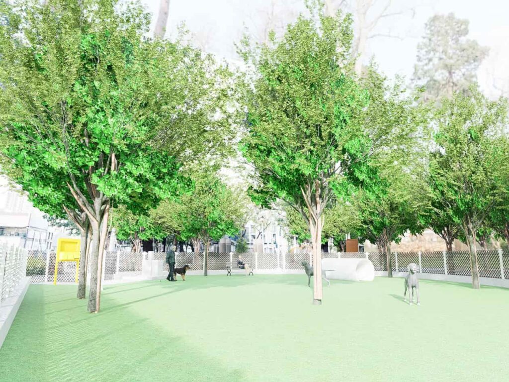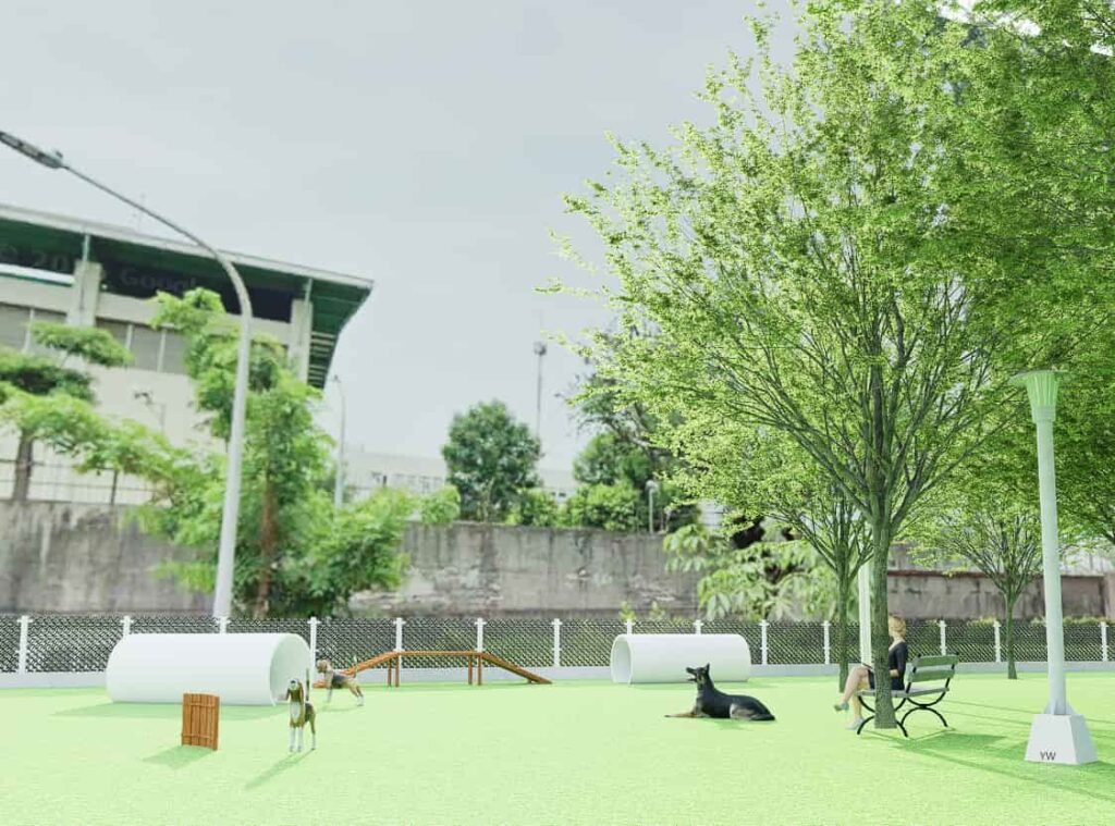 公園處進一步說明,文學公園狗狗活動區完工後將提供城市中一處專屬狗狗的綠洲,新設狗狗活動區,區分大犬與小犬的活動區,設置安全圍籬、雙層出入口、犬隻專屬遊具、飲水及清潔設備等服務設施,座椅配置則便利主人在休憩時與狗狗互動,兼顧安全與舒適。同時,地方也期望在活動區規劃時,能一併改善公園內老舊步道、排水及其他設施,提升公園整體環境,亦讓居民在共享空間中增進交流、享受生活!