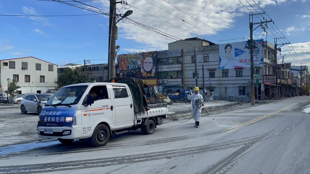 臺東縣環保局與8個鄉鎮市公所10月1至4日出動19位專業人員,以抓斗車、清溝車、灑水車前往光復支援環境整理,清理區域包括光華街、中正路一段、光復路、火車站旁右側停車場,協助清出約465公噸的污泥與廢棄物、也協助灑水、完成約18公里光復路、中正一路排水側溝清理,10月5日協助環境部緊急調集128隻清溝勺,急送花蓮光復。