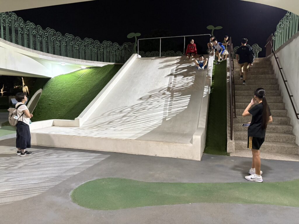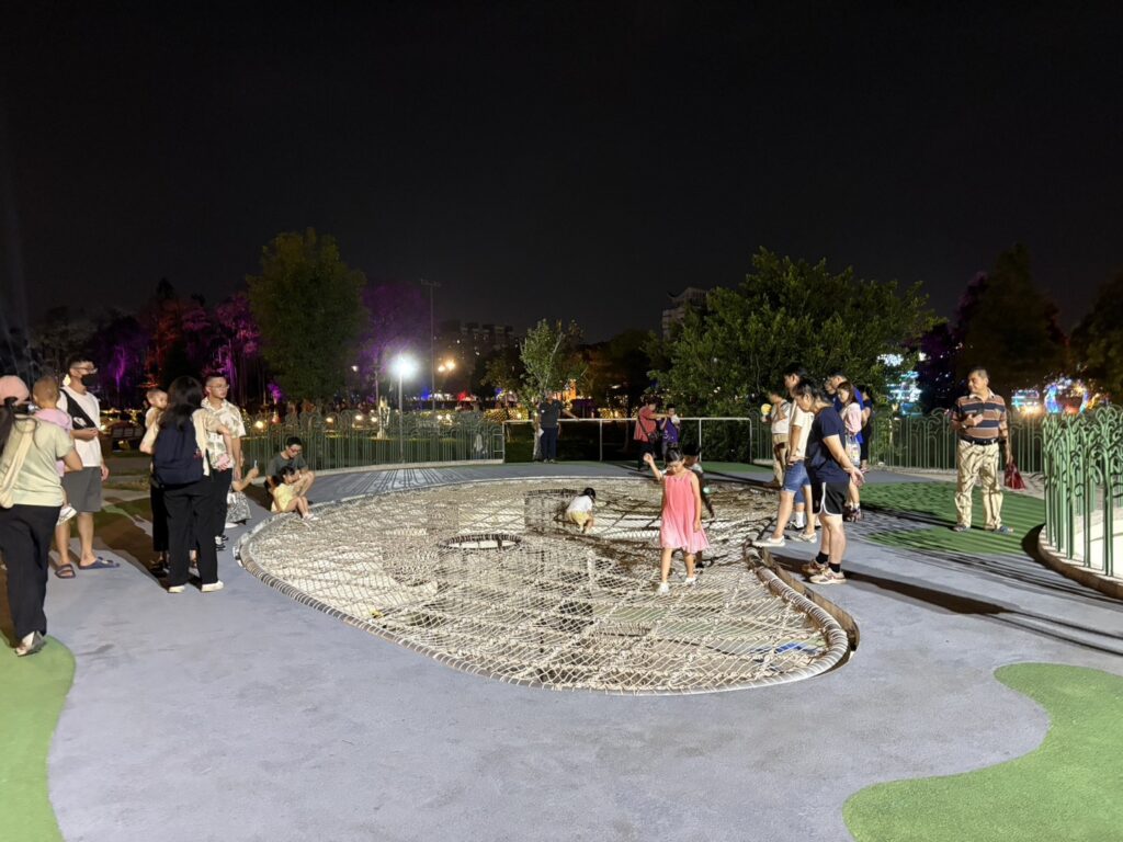 綠豆仁遊戲場設計多元,設施包含上層編織網區,提供彈性空間,鼓勵兒童攀爬、鍛鍊協調力;3公尺長滑梯區,讓孩子們安全滑行,兼具刺激與樂趣;下層共融沙坑區,促進不同年齡層孩童互動、共同遊戲;楓香步道融合自然景觀,成為親子散步與休憩的理想去處;夜間燈光設計則展現「越夜越美」的視覺效果,增添夢幻氛圍,成為夜遊嘉義的新亮點。
