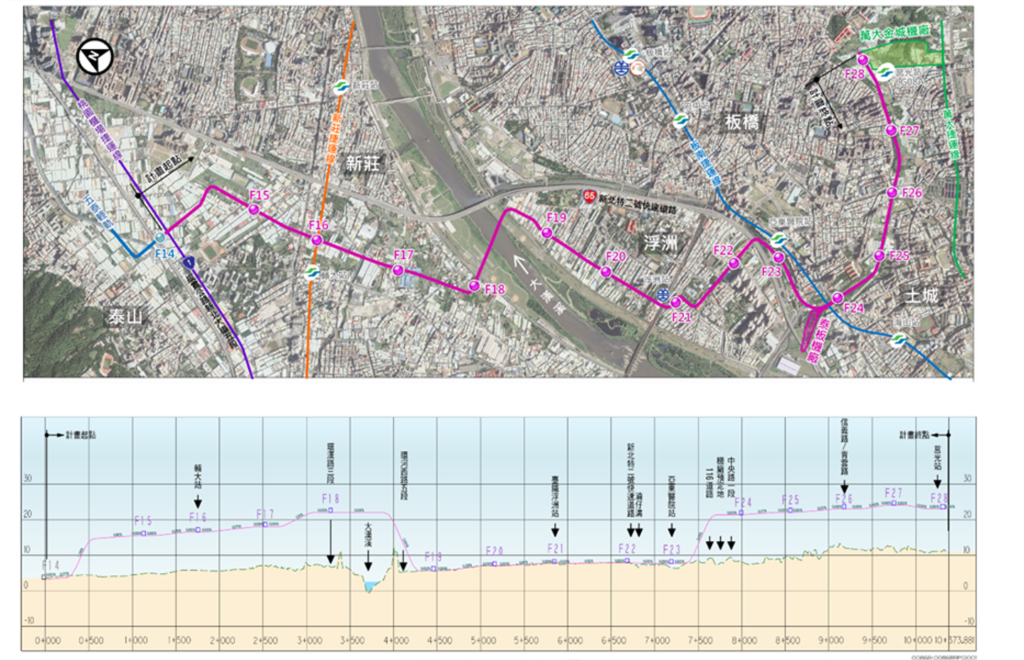 高架車站數增加7站!新北市長侯友宜表示,泰板輕軌規劃長度10.3公里、共14座車站,路線連接泰山、新莊、板橋、土城、中和地區,原先規劃F18及F24兩座高架車站、長2.5公里,至於F19~F23站(浮洲段)由於路線須從台鐵、高鐵與台65線高架橋下方穿越限制,須平面通行以確保安全性。而因應交通部審查意見,部分土地開發效益納入附屬事業收入以提高經營比,未符合計畫審議一致性及要求提升運量以確保財務永續經營,上述意見配合修正,並參考已通車捷運路線的經驗,決定將既有的2處高架段延長,增加7個高架車站,調整後高架段總長7.3公里、共有9座高架車站,分別為F15~F18站(新莊塭仔圳段)及F24~F28站(板橋中和土城農業區段),調整後列車同步能提高行駛速率,經估算全程行車時間可縮短11分鐘,以提升旅客搭乘意願及運量。