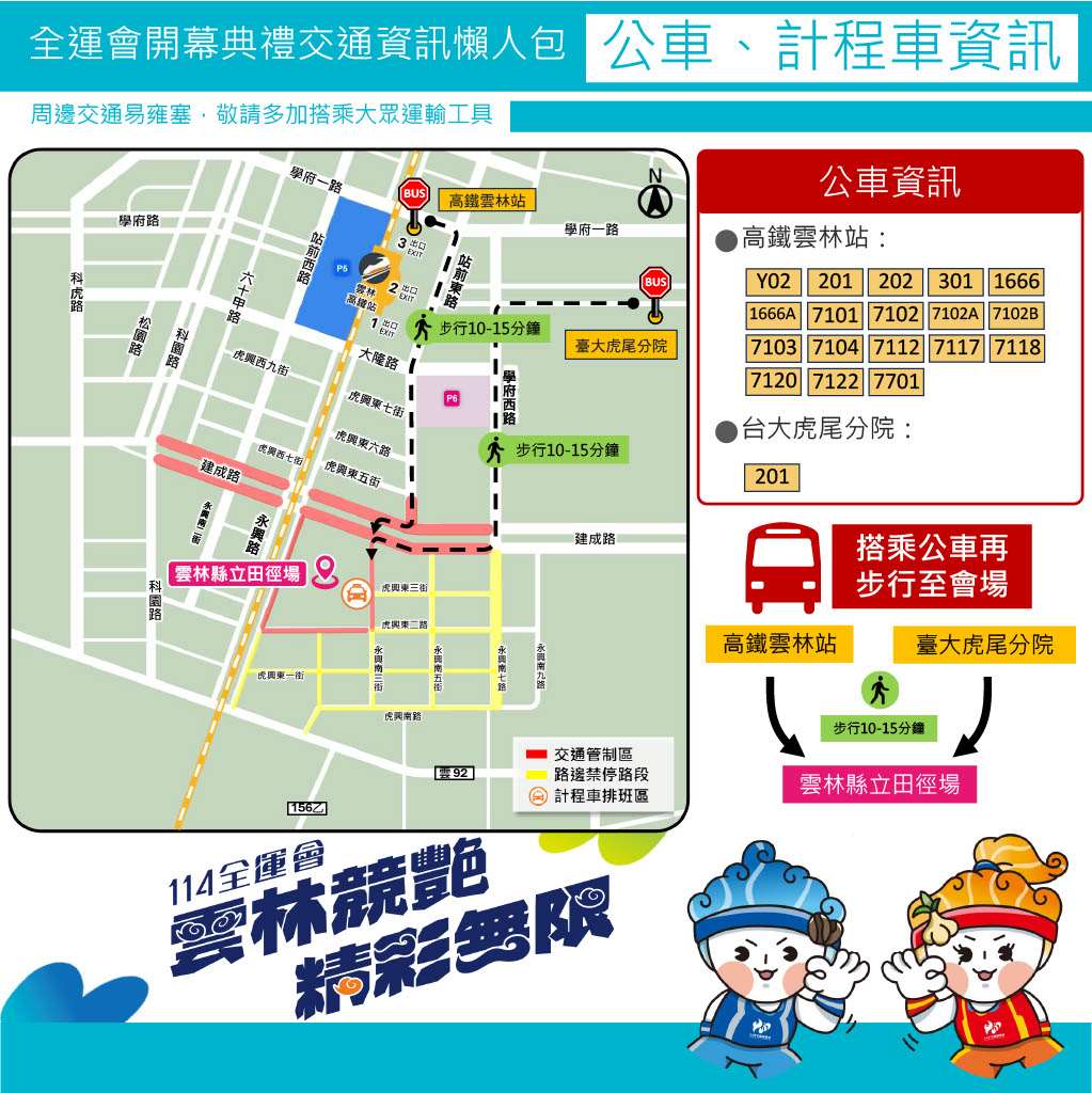 雲林縣政府呼籲民眾請儘早出門、善用大眾運輸與免費接駁車,為運動盛會加油,也為交通順暢盡一份心力!