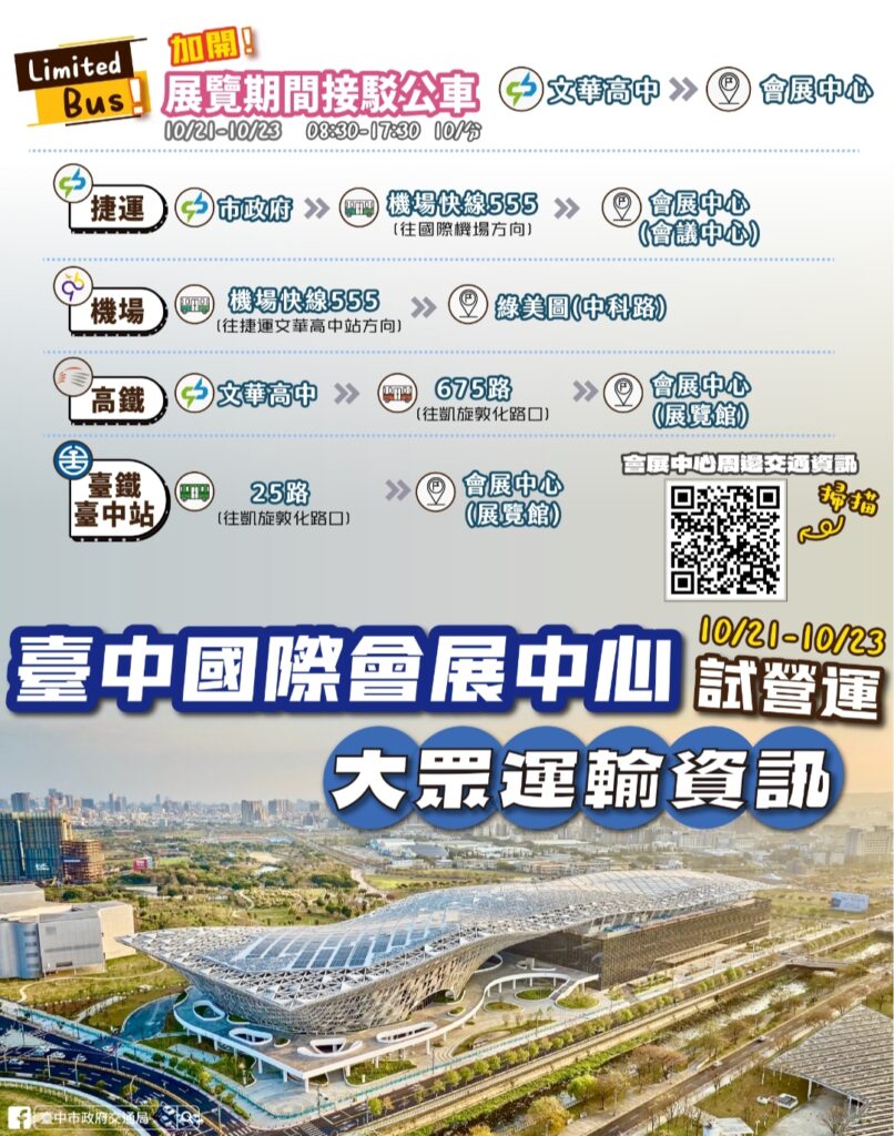 葉局長指出,台中國際會展中心為中台灣最大國際級展館,試營運首場「2025台灣國際五金工具博覽會x五金工業展(TiTE x IHT)」是全球五金業界重要的亞洲行程,為利國外旅客前往,新增機場快捷公車直達會展中心,可由機場搭乘555路機場快捷公車前往會展中心。同時,展覽期間也加碼開設接駁公車往返捷運文華高中站至會展中心,接駁公車服務由上午8時30分至下午5時30分、發車班距10分鐘一班。外地旅客搭乘高鐵抵達高鐵台中站後,可搭配捷運綠線至捷運文華高中站,轉乘675路公車前往會展中心;若搭乘捷運綠線至捷運市政府站,方便轉乘555路公車前往會展中心,歡迎民眾多加利用大眾運輸前往展覽會場。