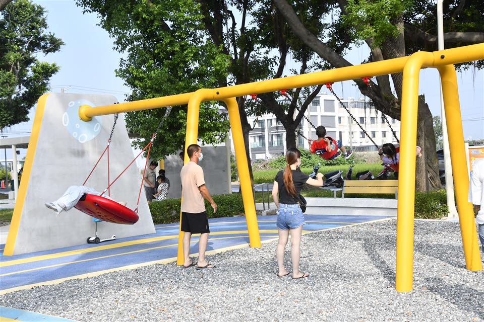 王縣長表示,很開心與鄉親共同見證和平公園全新啟用。園內最吸睛的設施,是高達 14 公尺的探險飛梭、登艙棧橋、月球遊戲丘、飛天鞦韆、太空跳躍及旋轉飛盤等多元遊具。不論大小朋友都能在此開心暢玩,其中「星際寶寶」是以火龍果為意象的可愛角色。園內設有 250 公尺步道,可以邊走邊玩,還有親子無障礙廁所,期盼從幼到老、全齡共融。未來縣府會持續打造更多讓孩子歡笑及家庭團聚的空間,實現「美好彰化 希望城市」的願景。