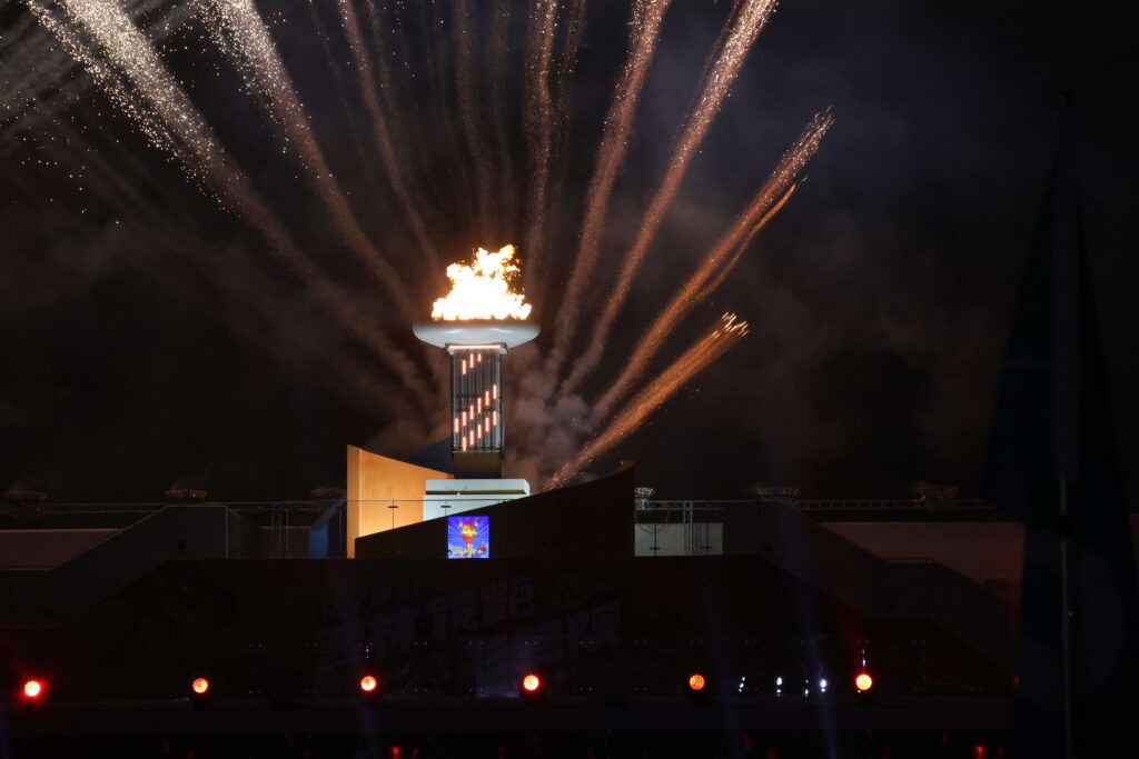 全運會聖火由雲林縣長張麗善、台東縣長饒慶鈴、慈善者陳樹菊護送進入會場,傳遞給羽球教練程峻彥、田徑隊教練廖佩苓,再傳遞給國家訓練中心田徑教練林進福及軟網國手鄭竹玲教練,最後交棒給棒球新星鍾亦恩、武術精靈林千禧點燃聖火。老中青3代運動員接續傳遞,不僅象徵運動精神的傳承,更符應雲林縣推動品德教育的精神。