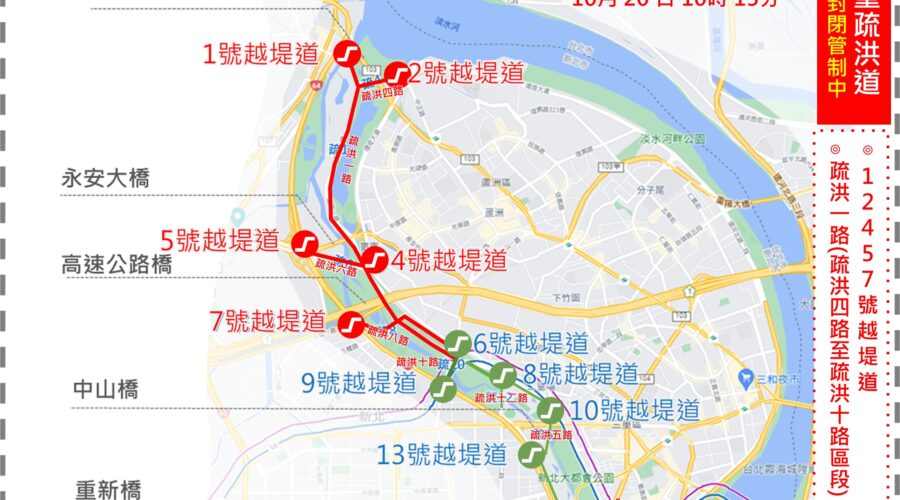 因114年10月20日豪大雨及抽水站抽排水,再加上大潮影響,二重疏洪道已積淹水,將管制疏洪十路以北區域必要路段及越堤道,為顧及民眾安全,市府已派員進行上開路段道路管制,切勿強行進入封閉路段。並提醒民眾提早配合改道,以確保民眾安全。
