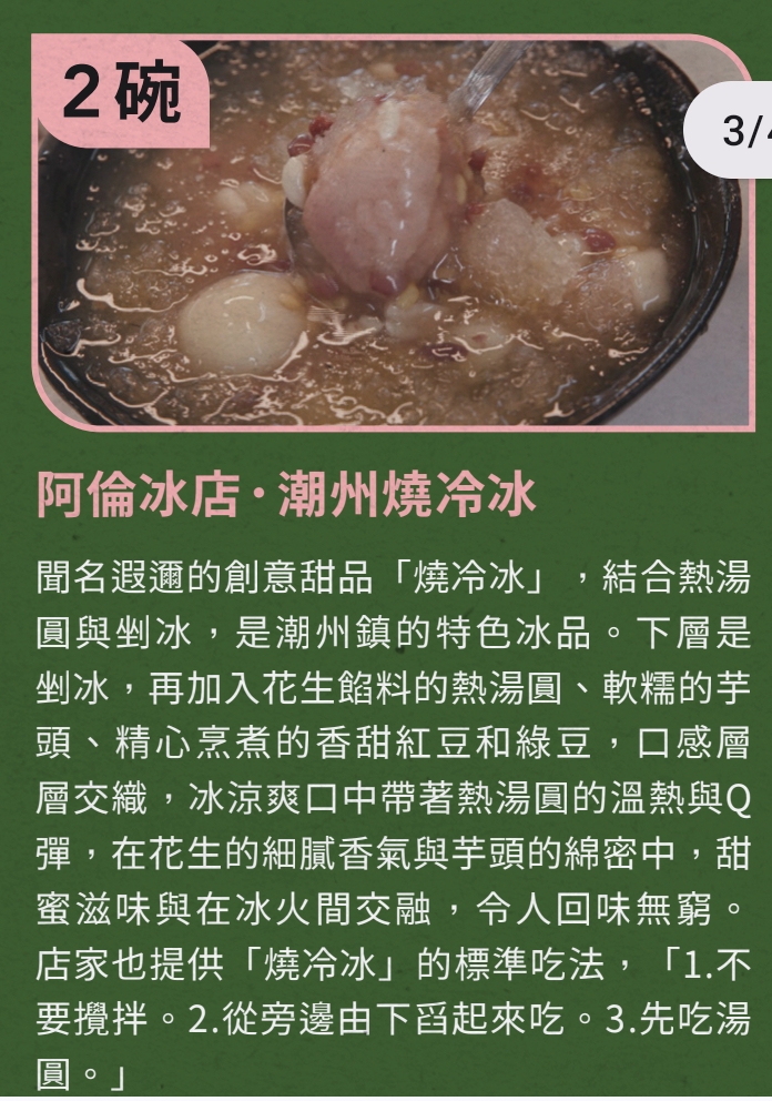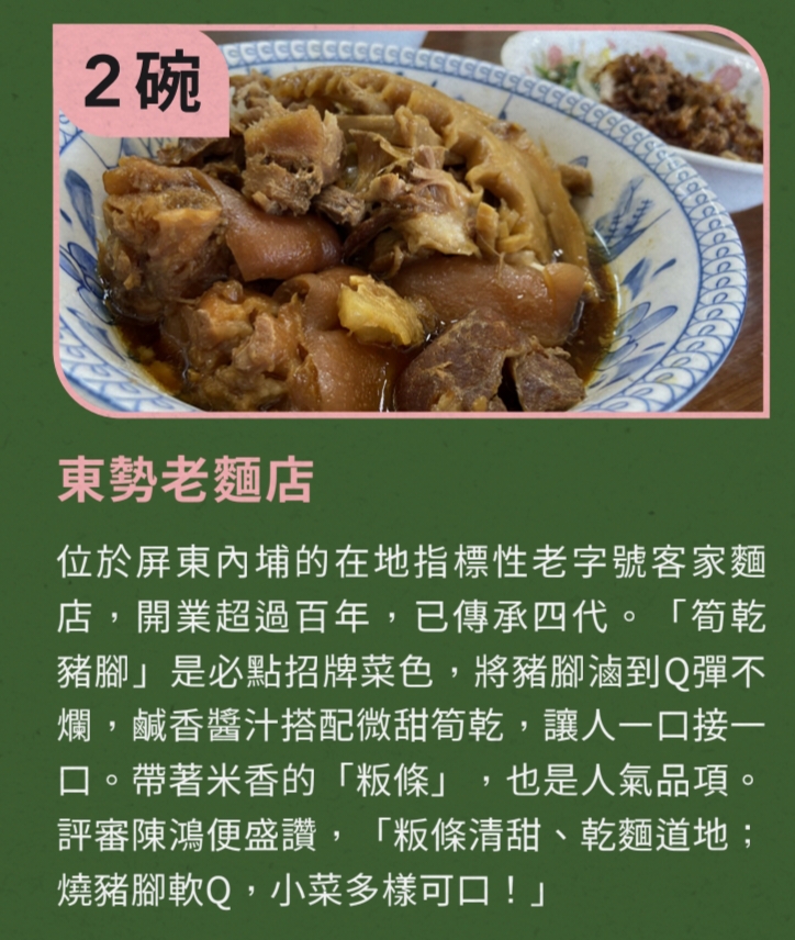 入榜的店家充分展現屏東多樣的飲食文化與地域風貌。其中,東港鎮逾50年歷史、傳承三代的老字號店家勇奪3碗,大受評審青睞;另有4家店分別獲得2碗肯定,橫跨麵食、甜品與傳統小吃,地域遍布屏北、屏中及屏南地區,勾勒出屬於南國的美好滋味。此外還有89間店家,獲得1碗肯定。