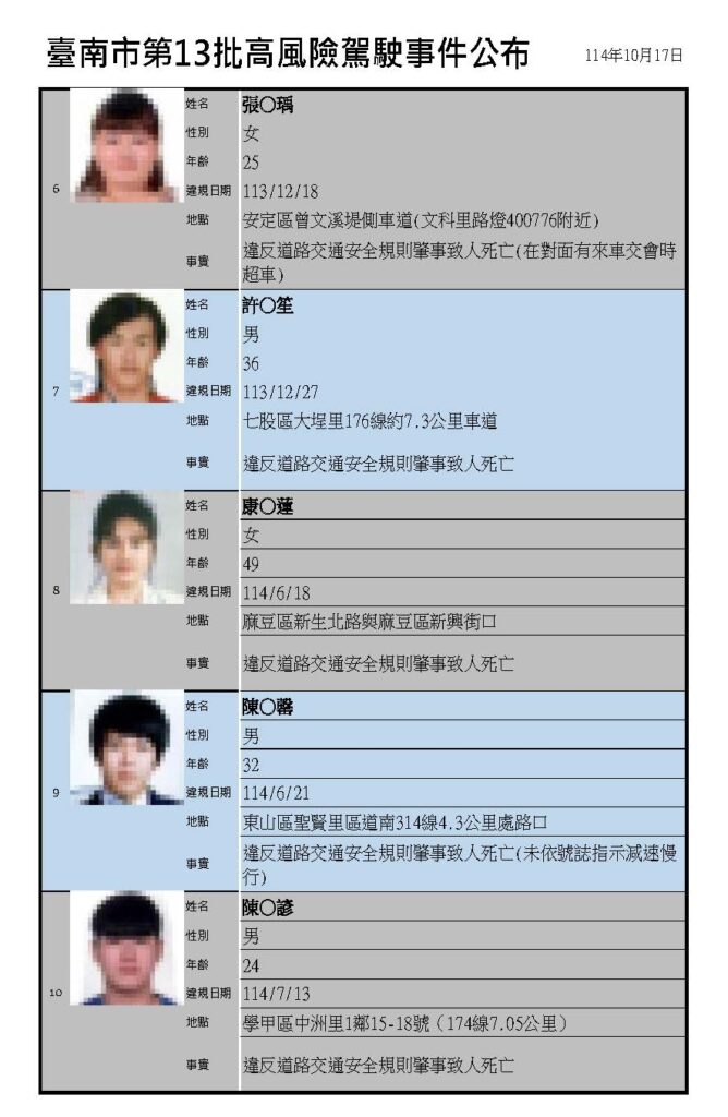 台南市政府交通局表示,台南市高風險駕駛事件資訊公開作業原則於112年8月11日公告施行,公告對象係就汽車駕駛人違反道路交通管理處罰條例因而肇事致人重傷或死亡者,或有其他受社會矚目的交通違規事件;於裁決處分完成後,依照公開作業原則將相關資訊去識別化,公布在交通局網站「高風險駕駛事件公布專區」。