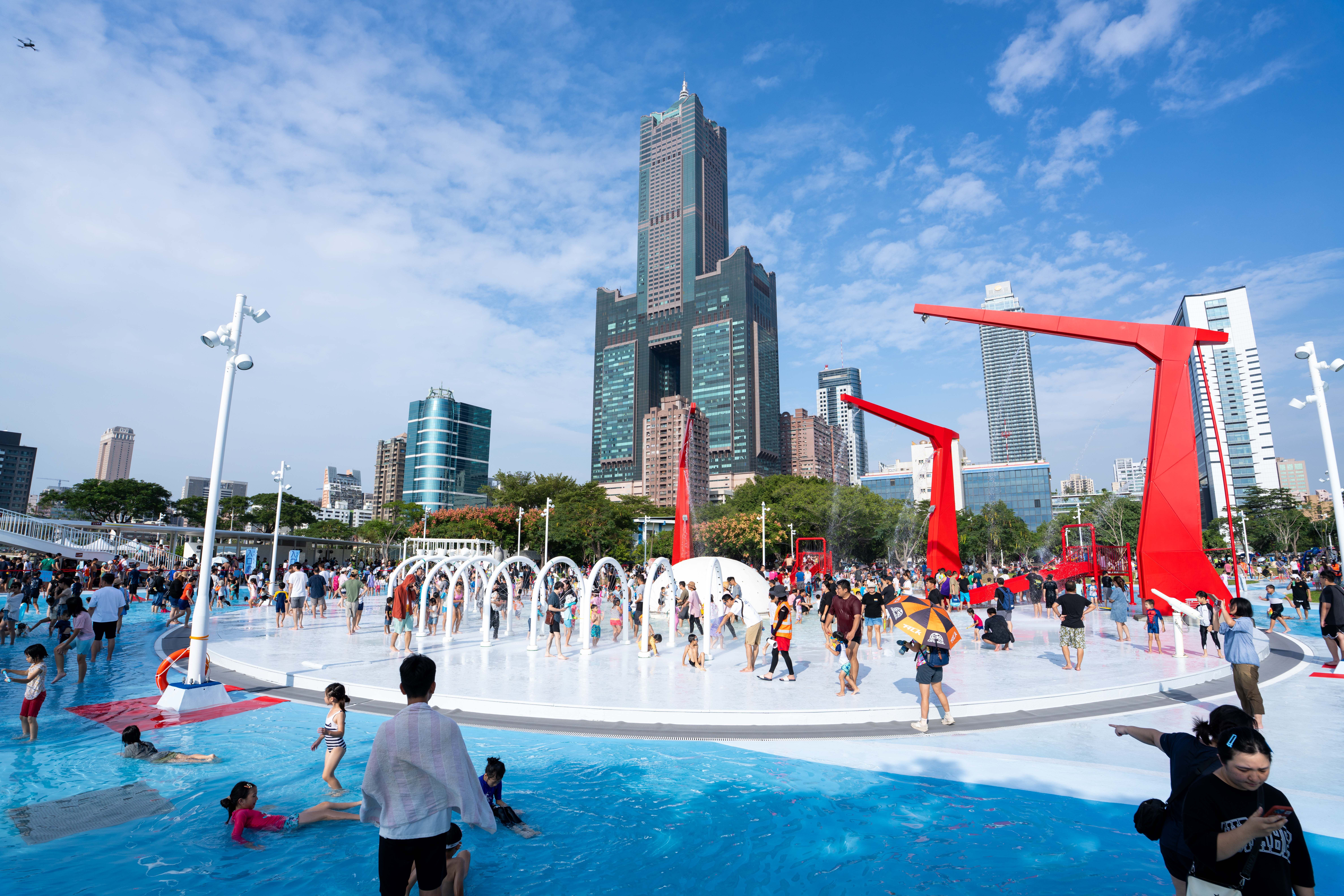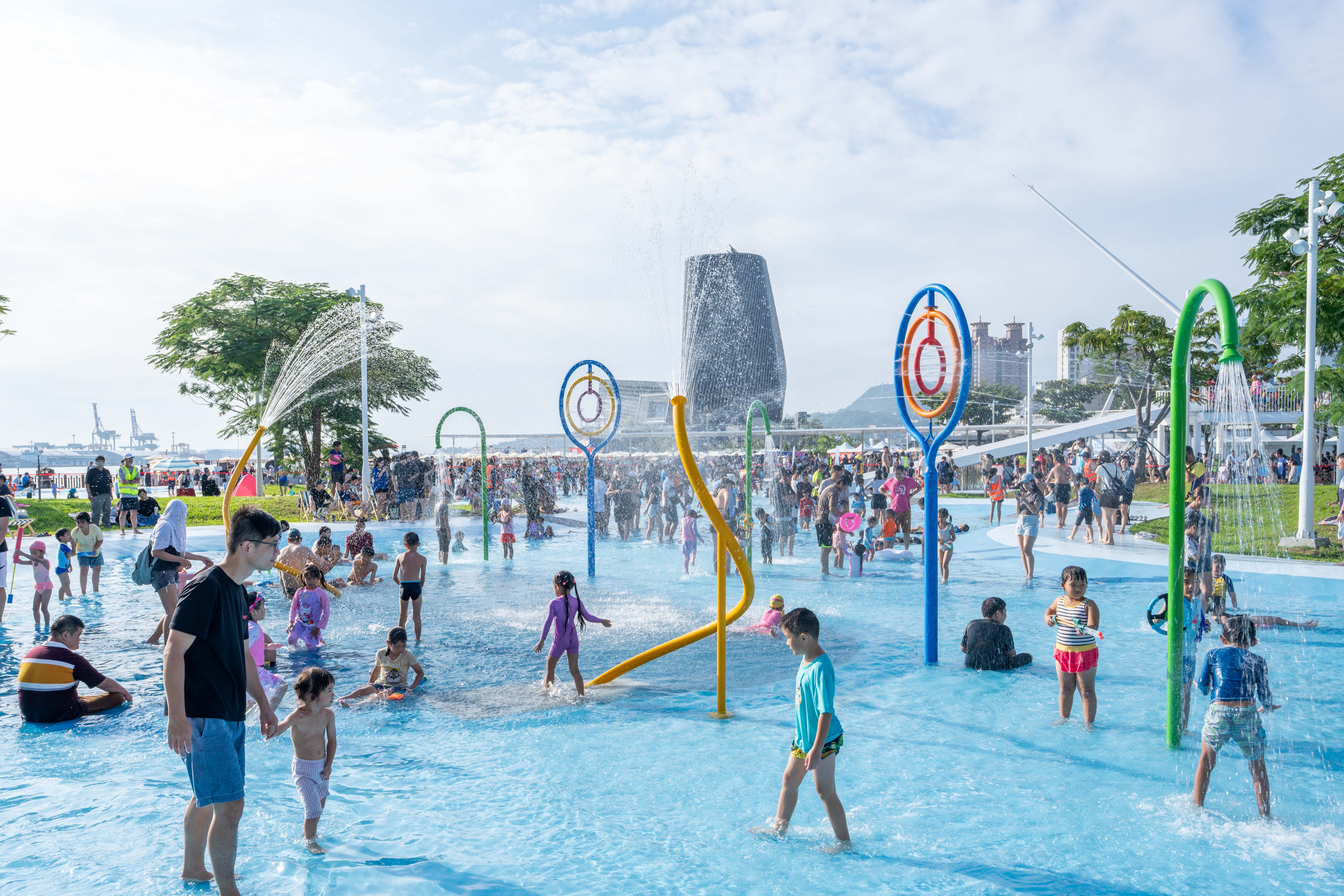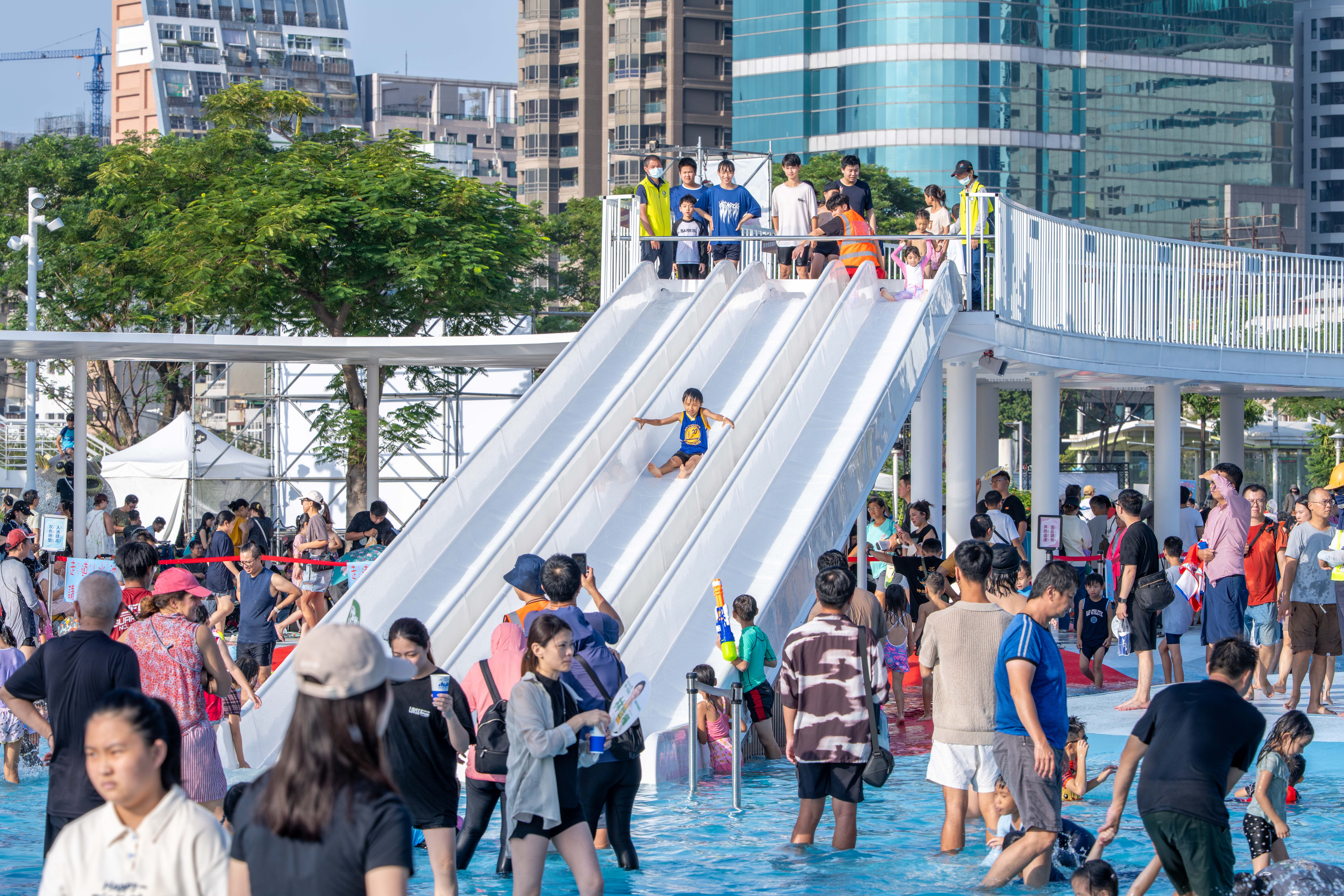 高雄市政府響應中央向海致敬政策,感謝海洋委員會補助經費及港務公司提供港區水陸域場地,攜手打造全民共享水上樂園,「星光水岸公園」搭著海洋派對熱潮於今日開放試營運,吸引許多市民搶先體驗,陳其邁與大小朋友一起同樂、合照,現場氣氛熱烈。工務局表示,星光水岸公園採「水陸雙主題」開放設計,設有多項水上遊具、滑水道與無邊際鞦韆拍照區等熱門設施,玩水同時欣賞港景風光。