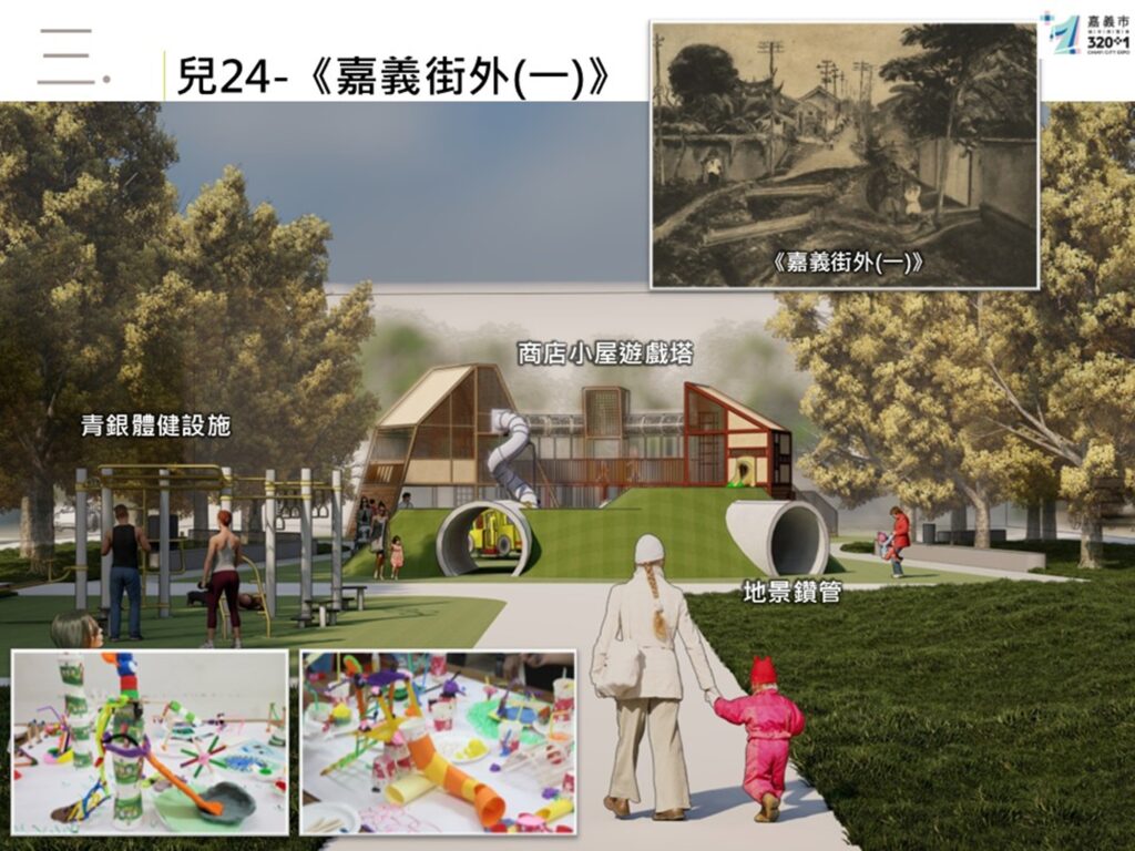 市府建設處表示,本工程有13個基地,面積合計1.9公頃,總經費8,561萬元,其中工程經費7,590萬元,工期365天,由惇陽工程顧問有限公司設計監造、陸奕營造有限公司施工。公園將設置5處主題共融式遊戲場及8處簡易綠化公園,不僅在開闢前廣納民眾意見,「所有願望一次滿足」,建置適合青銀族群使用的遊具、串聯公園間步道,也依據小朋友們的期待,建置滑梯、秋千、滑步車練習場等遊具與場域,更融合在地文化意象及陳澄波老師畫筆下的嘉義風光發想,打造兼具藝術、美學與休憩功能的都市綠地。