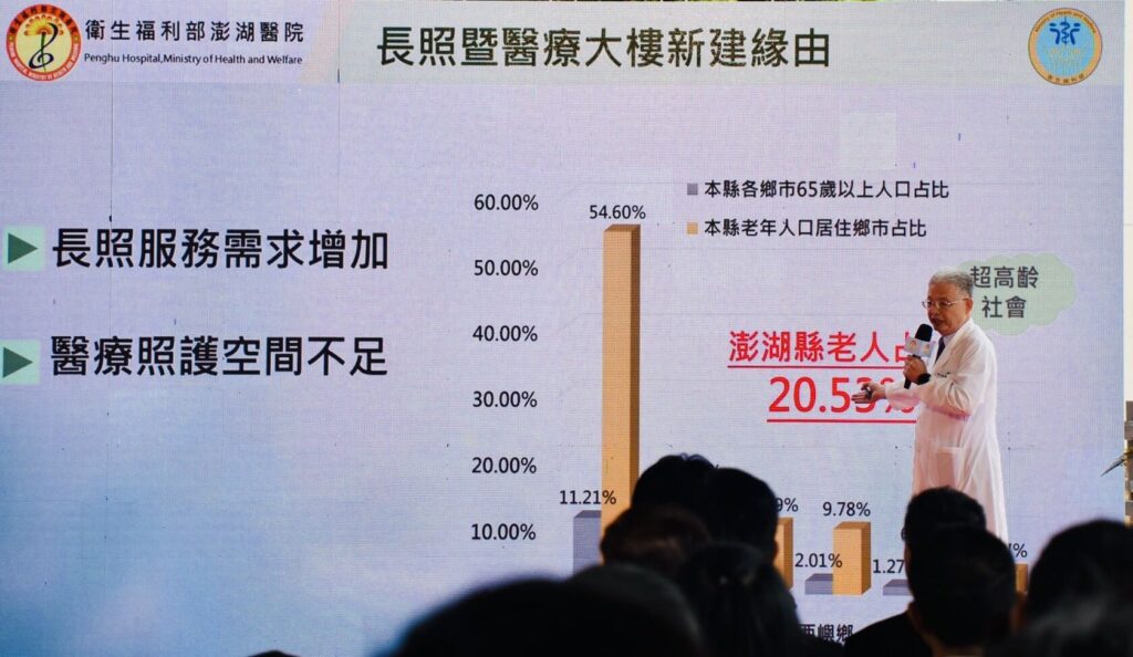 衛福部澎湖醫院「長照暨醫療綜合大樓」,規劃興建地上八層、地下一層的長照暨醫療大樓一棟,包括三樓設置綜合病房40床及加護病房(ICU)10床,五至八樓則設置200床住宿型長照床位,並整合門診、ICU及長照服務功能,提供生活照顧為主、醫療照護為輔之照護模式,實現全人照護理念。