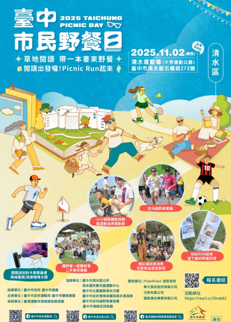 陽光灑落的秋日午後,最適合帶著野餐墊,和家人朋友共享美好時光!由台中市政府運動局與清水區公所共同主辦的「2025臺中市民清水區野餐日」,將於 11月2日(日)上午9時至下午5時 在清水體育場熱鬧登場。今年活動以 「運動×閱讀×親子」 為主題,邀請大小朋友一起動一動、讀一讀、笑一笑,在綠草地上展開一場充滿幸福能量的秋日野餐盛宴。