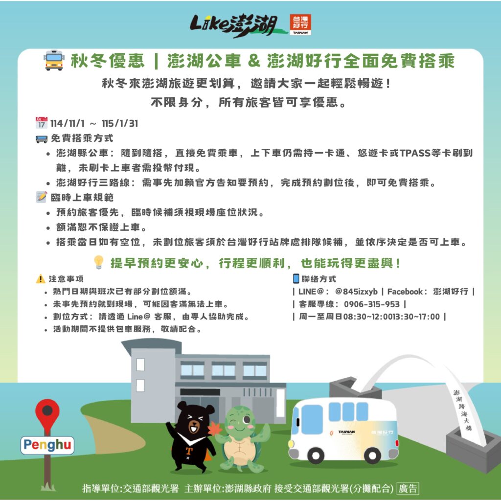 配合澎湖縣政府「2025冬遊澎湖消費券」優惠措施,自114年11月1日至115年1月31日止,旅客遊澎湖即可享有澎湖縣公車及澎湖好行3路線免費搭乘服務,不限身分,所有旅客皆可享有優惠,邀請大家一起輕鬆暢遊!