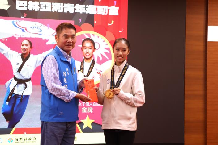 縣長鍾東錦並頒發2位選手各6萬元獎勵金,議長李文斌、跆拳道委員會主任委員羅貴星、田徑委員會副總幹事江燕輝、苗栗市長余文忠亦分別頒贈林巧鈴、潘筱晴獎勵金,鼓勵2位選手再接再厲,續創佳績。