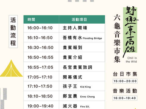 秋高氣爽、適合旅遊的秋季,正是體驗高雄溫泉與山林野趣的最佳時機。由高雄市政府觀光局主辦的「野趣東高雄:六龜音樂×市集」,將於11月8日在六龜新開紀念公園盛大登場。活動以「聆聽土地的邀請」為核心概念,特別邀請日本九州熊本地區的特色店家參與,藉由跨越國界的市集展現地方風土特色,並透過在地觀光活動深化台日交流。同時,更邀請滅火器、鄭宜農等金曲獎重量級卡司輪番開唱,搭配超過40家台日攤商共襄盛舉,帶來特色農特產、原創手作與輕食小點等各類美食餐車,邀您走進東高雄,親身感受秋季山林與音樂交織的療癒魅力。