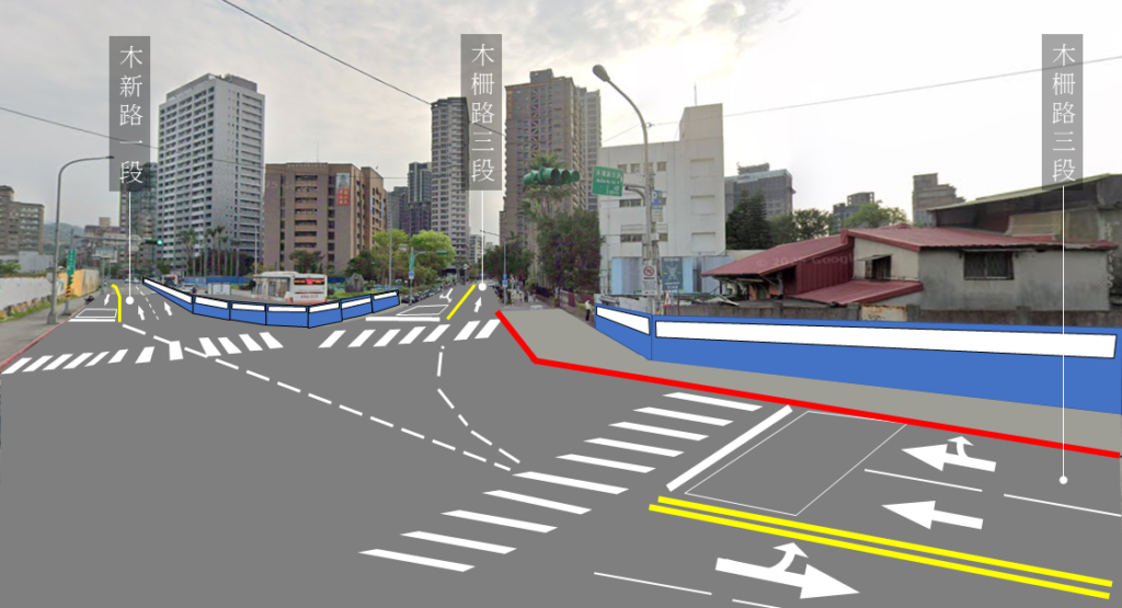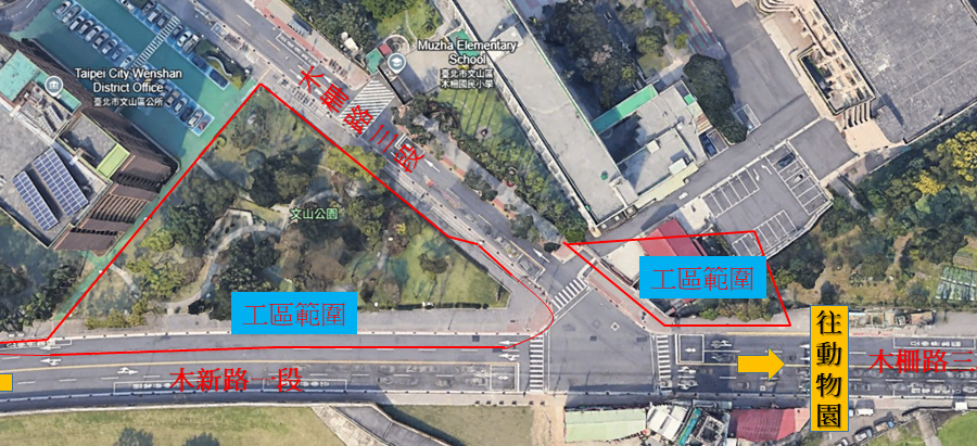 本階段工程於木新路1段(開元街口至木柵路3段口)縮減車道,由雙向各2個車道變為北向1個車道(往動物園方向)及南向2個車道(往新店方向),工區採施工圍籬區隔工區、車道及人行道。施工期間請用路人配合改道通行,遵循導引標誌及現場指揮人員指示減速慢行,並請民眾多加利用大眾交通運輸工具。
