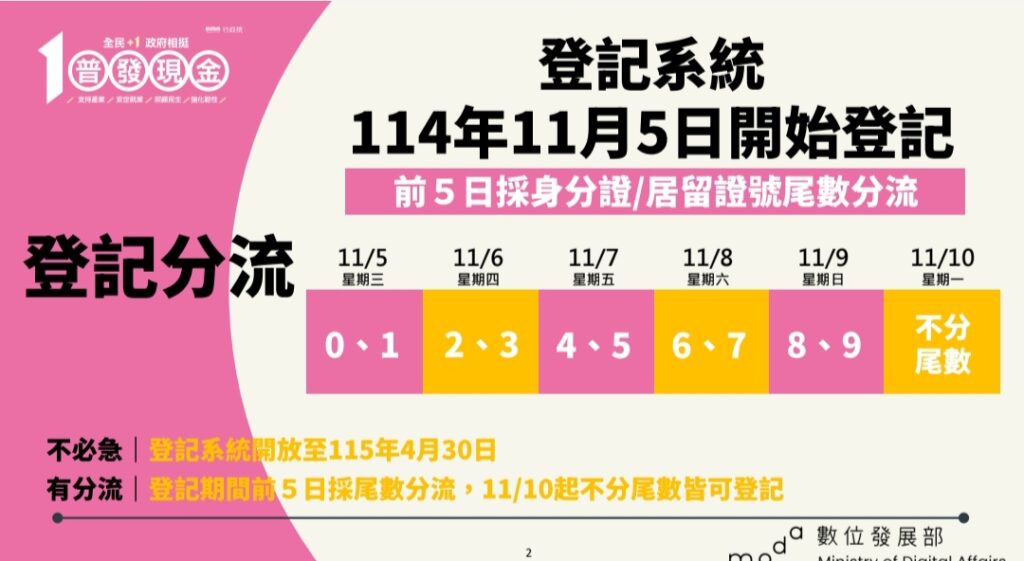 為因應即將開放線上登記作業,財政部今(4)日與數位發展部共同召開記者會,邀請行政院打擊詐欺指揮中心、金融監督管理委員會、中華郵政股份有限公司、財金資訊股份有限公司及關貿網路股份有限公司參與,透過本次記者會加強說明普發現金領取方式及介紹廣宣網站內容,並由數位發展部說明登記入帳系統操作方式,及登記期間前5日(11月5日至11月9日)以身分證字號或居留證號尾數分流方式如下: