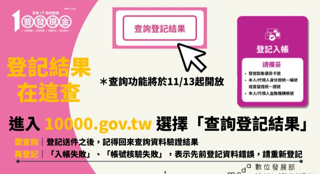 該部補充說明,凡於預登記期間及11月10日當天完成登記並經系統檢核成功者,款項將於11月11日18時起至11月12日依各銀行作業程序陸續入帳;11月11日以後登記成功者,於登記後2個營業日內入帳,為確保款項順利入帳,民眾務必補摺或至網路銀行或行動銀行查詢確認入帳。民眾可自114年11月13日起至普發現金官網查詢登記結果,如因資料錯誤導致登記失敗或入帳失敗,網頁將提示原因並開放重新登記,或民眾可改採ATM領現或郵局領現。