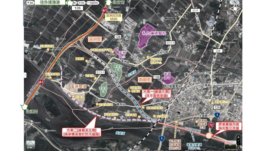 交通工務處進一步說明,依據交通部公路局最新資料,其優選方案係改採方案一直線案,與前期行政院110年10月核定可行性研究路廊方案二後龍溪北岸明顯不同,原因在於依據經濟部水利署113年1月修訂「申請施設跨河建造物審核要點」規定:橋梁不能落墩於堤前坡、水防道路及河川治理線內,意即橋墩無法比照頭屋、公館路段落墩後龍溪河堤外,只能在堤後波新建橋墩,防汛道路須往內側移設,在維持既有防汛道路功能,以及確保新增路權範圍用地取得情形下,導致方案二沿線預計拆遷建物數量高達35棟,包含溪洲社區眾多建物及沿線重要寺廟,對地方影響層面巨大,該方案已明顯不符經濟效益,故經顧問公司專業評估後,改採方案一直線方案為優選方案,同樣採用高架橋方式佈設跨越台1線、台鐵、北勢溪增設台61線系統交流道,橋下增設平面側車道供地方農路通行,且高架橋下空間可做多功能用途,具經濟效益。