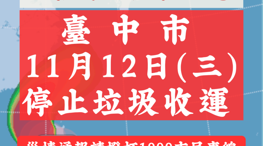 環保局表示,因應台中市災害應變中心今日下午一級開設,明(12)日星期三為清潔隊公休日,原有市場垃圾收運等工作停止。環保局籲請市民注意自身安全,垃圾暫停收運期間請將垃圾暫留家中,勿任意棄置,以免影響環境衛生及堵塞水溝造成淹水。