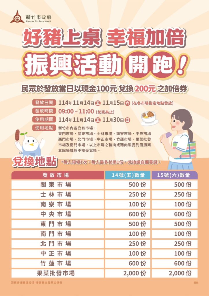 產發處表示,「振興豬肉產業加倍券」將於11月14日及15日連續兩日,在東門市場、關東市場、士林市場、南寮市場、中央市場、南門市場、北門市場、中正市場、果菜批發市場及竹蓮市場等10處公有零售市場同步發放。民眾可於發放當日以現金100元兌換200元加倍券,並可於超過240家張貼「合作店家」貼紙的豬肉或豬肉製品攤商使用,加倍享受超值優惠與在地好滋味。