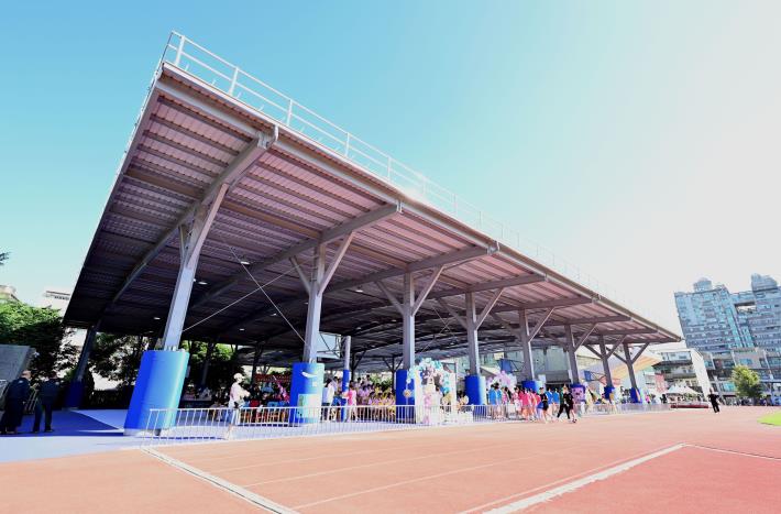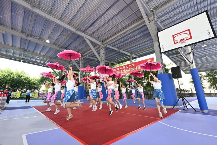 全新光電球場結合遮陽、發電、照明三大功能,白天可供應綠電,達到節能減碳與永續利用的目標。球場採壓克力舖面與LED燈具設計,提升運動安全與舒適度,讓體育課、社團及選手訓練可全天候進行,真正落實「晴雨無阻、隨時開賽」的精神。此次啟用範圍包含5面標準籃球場與一座結合太陽能板、可容納260台腳踏車及80輛機車的多功能車棚,整體設計兼顧運動空間實用性與綠能發電效益,展現校園現代化與永續發展新風貌。