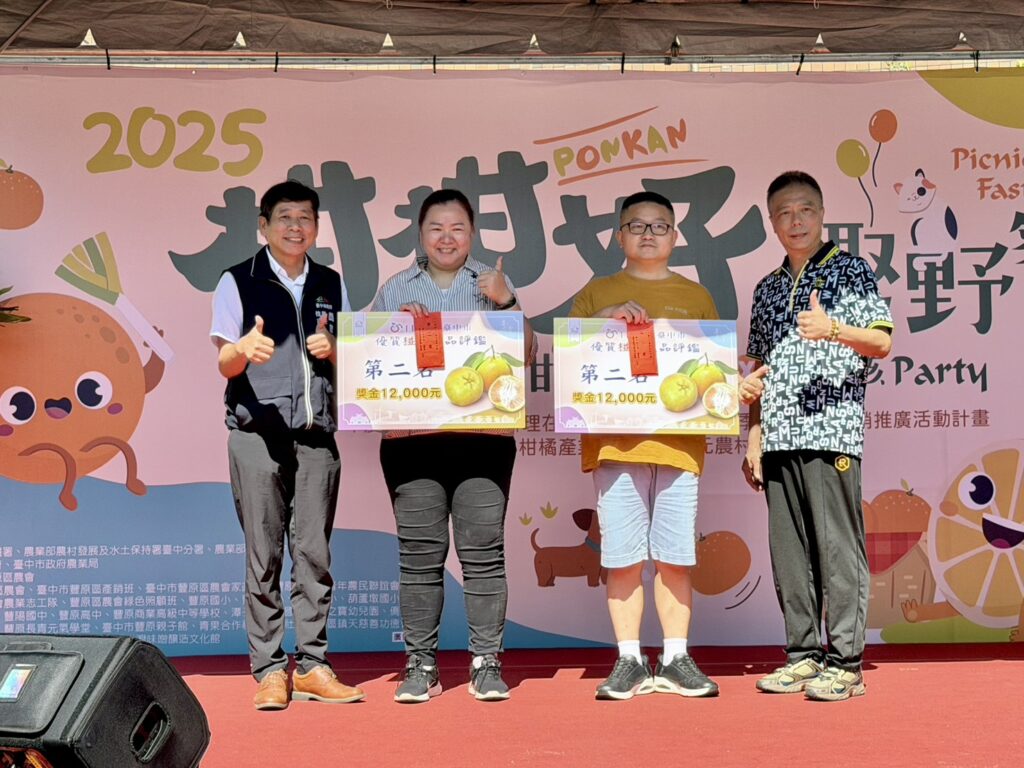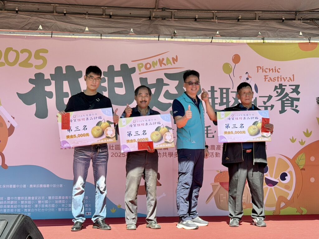 農業局說明,本次評鑑共80組農民參賽,邀請農業部農糧署、台中區農業改良場及台北農產運銷公司等單位專家擔任評審,依據果品外觀、風味質地及糖度等項目評分。經評審仔細品評,由東勢區詹前慶奪得第一名,獲頒椪柑王獎牌及獎金2萬5,000元;第二名為豐原區游文元及東勢區張健銨,各獲獎牌及獎金1萬2,000元;第三名為石岡區張永良、豐原區黃輝煜及朱銘祥,各獲獎牌及獎金5,000元。