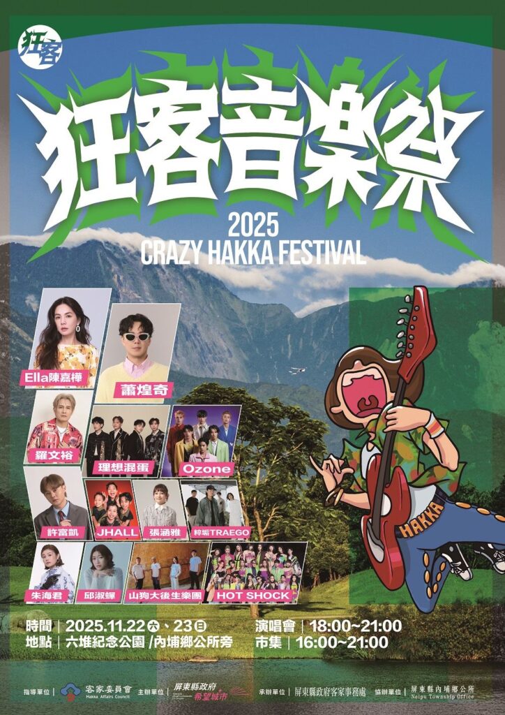 屏東縣客家音樂盛典「2025狂客音樂祭」,將於11月22、23日在屏東縣內埔六堆紀念公園登場!首日由金曲歌后Ella陳嘉樺與邱淑蟬、金曲歌王羅文裕及許富凱、J HALL、張涵雅、Hot shock等跨界合作;第二天則由金曲歌王蕭煌奇、金曲歌后朱海君、山狗大後生樂團與理想混蛋、粹垢、Ozone等團體,共同帶來最狂最精彩的客家音樂饗宴。