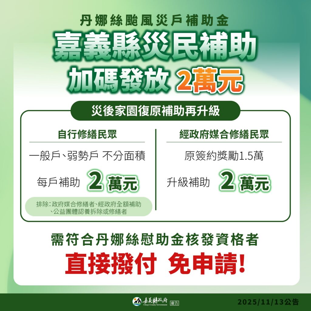 丹娜絲風災嘉義縣加發「加速重整家園補助金」2萬元 即日起陸續撥付