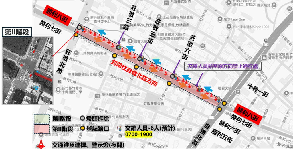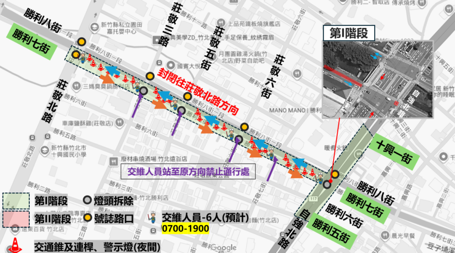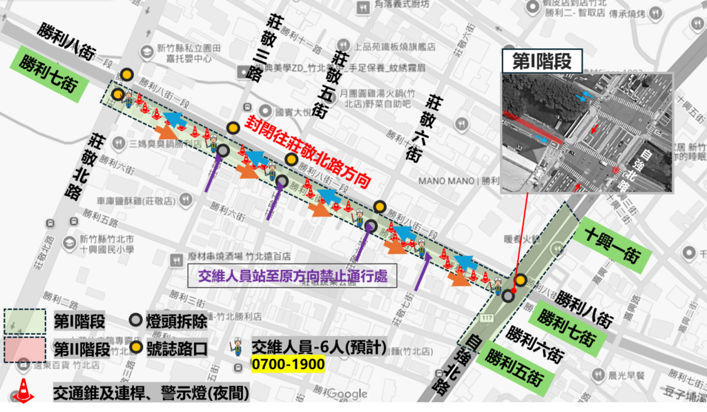 竹北市勝利七、八街(莊敬一路至莊敬北路區間)於今年3月實施第一階段單行道交通動線,而自12月1日起,則將於勝利七、八街(莊敬北路至自強北路)施作第二階段工程。