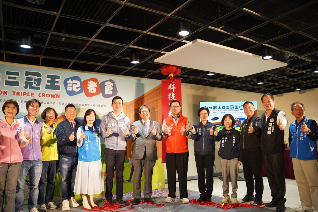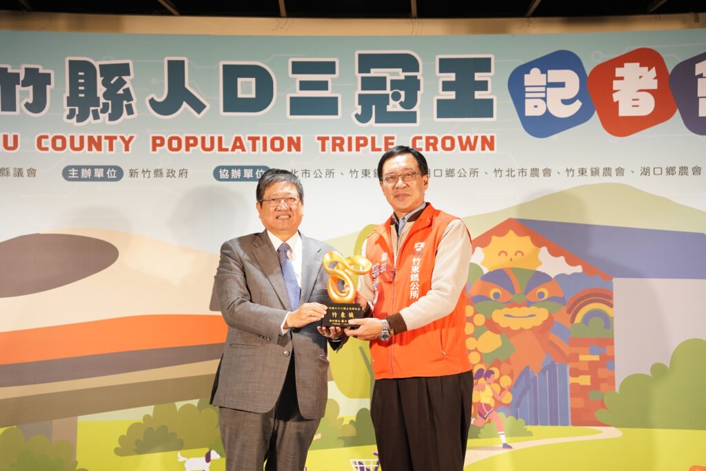 新竹縣竹北市、竹東鎮及湖口鄉三鄉鎮市同步突破人口新高,成為全國人口最大的鄉、鎮、市,為慶祝「人口三冠王」活動,新竹縣政府今天(26日)舉辦記者會,新竹縣長楊文科與竹北市長鄭朝方、竹東鎮長郭遠彰、湖口鄉長吳淑君等同台,楊文科指出,按照現今的人口成長速度,新竹縣有望於明年底突破60萬人口,顯現新竹縣具有發展潛力、樂齡宜居,逐步邁向「科技首都.幸福竹縣」的願景。