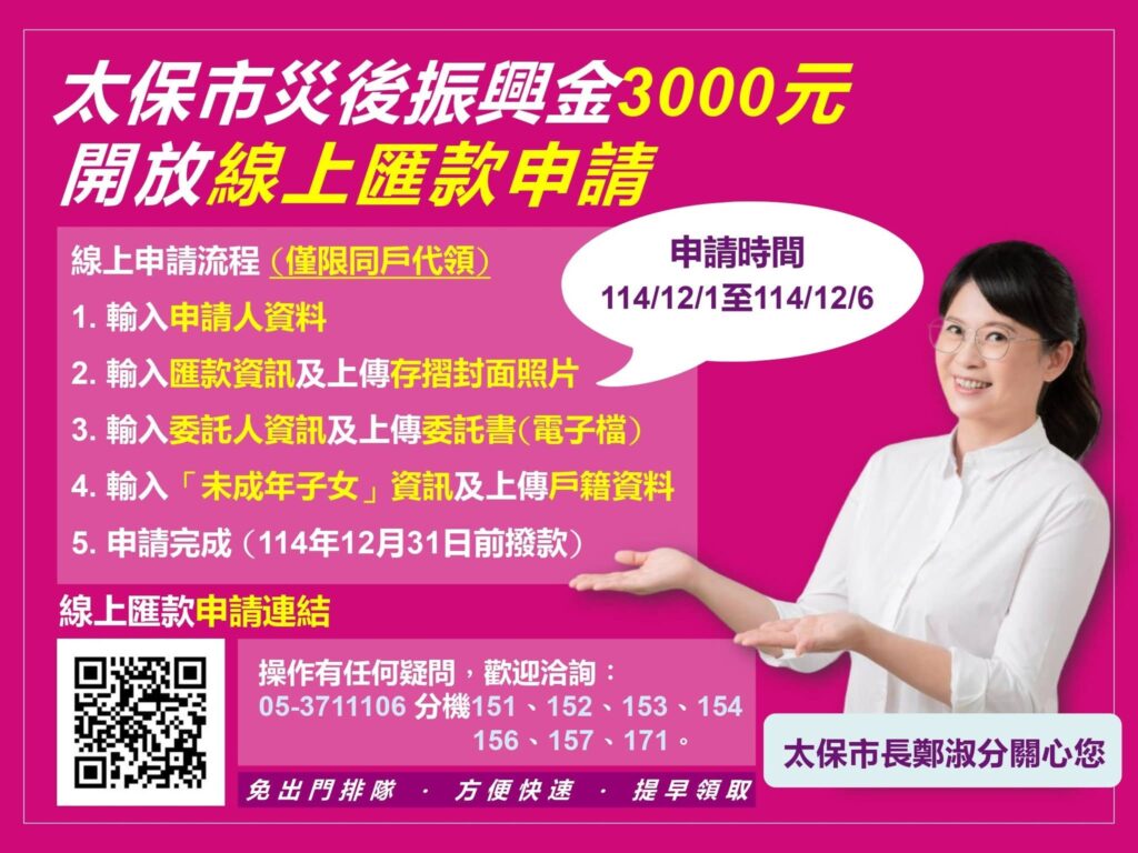 公所團隊已完成所有行政程序,也會在期間全力協助每位市民順利領取振興金。讓我們一起努力,陪伴太保市在災後恢復元氣、持續向前!