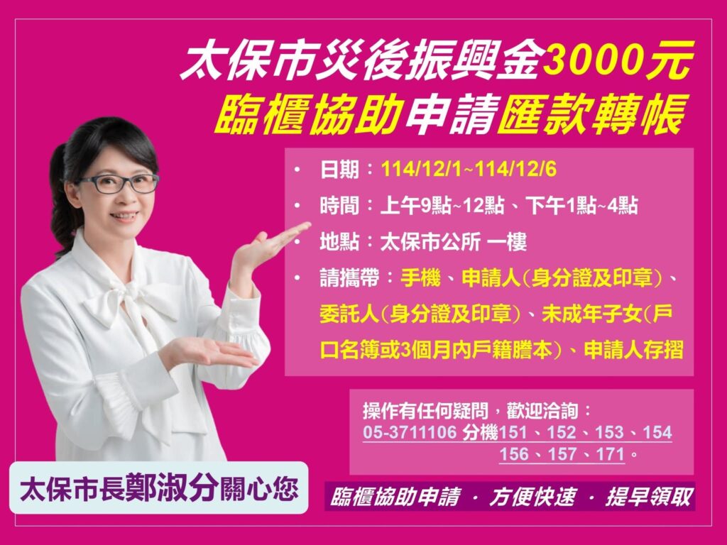 太保市發放災後振興金3000元!12/1至12/6開放申請