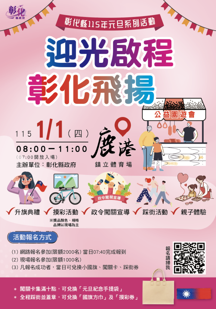 為迎接中華民國115年元旦,彰化縣政府將於115年1月1日(星期四)上午8時至11時,在鹿港鎮立體育場舉辦「迎光啟程.彰化飛揚」元旦系列活動。彰化縣長惠美誠摯邀請縣民朋友在新年的第一天清晨,與家人、朋友一同參加元旦系列活動,到場歡慶元旦新年喜悅!